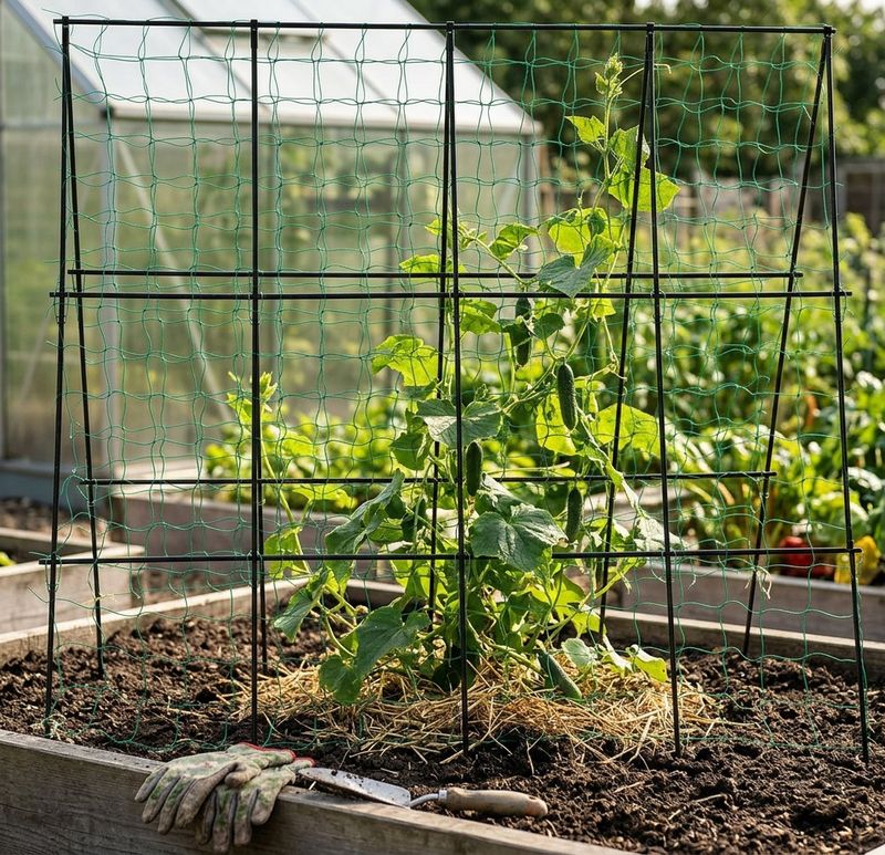 Sieť na uhorky s konštrukciou, 1,2×1,2m | Strend Pro je praktická opora pre pestovanie uhoriek a iných popínavých rastlín. Zabezpečuje lepšie prevzdušnenie porastu, jednoduchší zber úrody a čistejšie plody bez kontaktu so zemou. Pevný rám v kombinácii so sieťou umožňuje rastlinám rásť vertikálne, čím šetrí miesto, zlepšuje prístup k plodom a podporuje zdravý rast.
