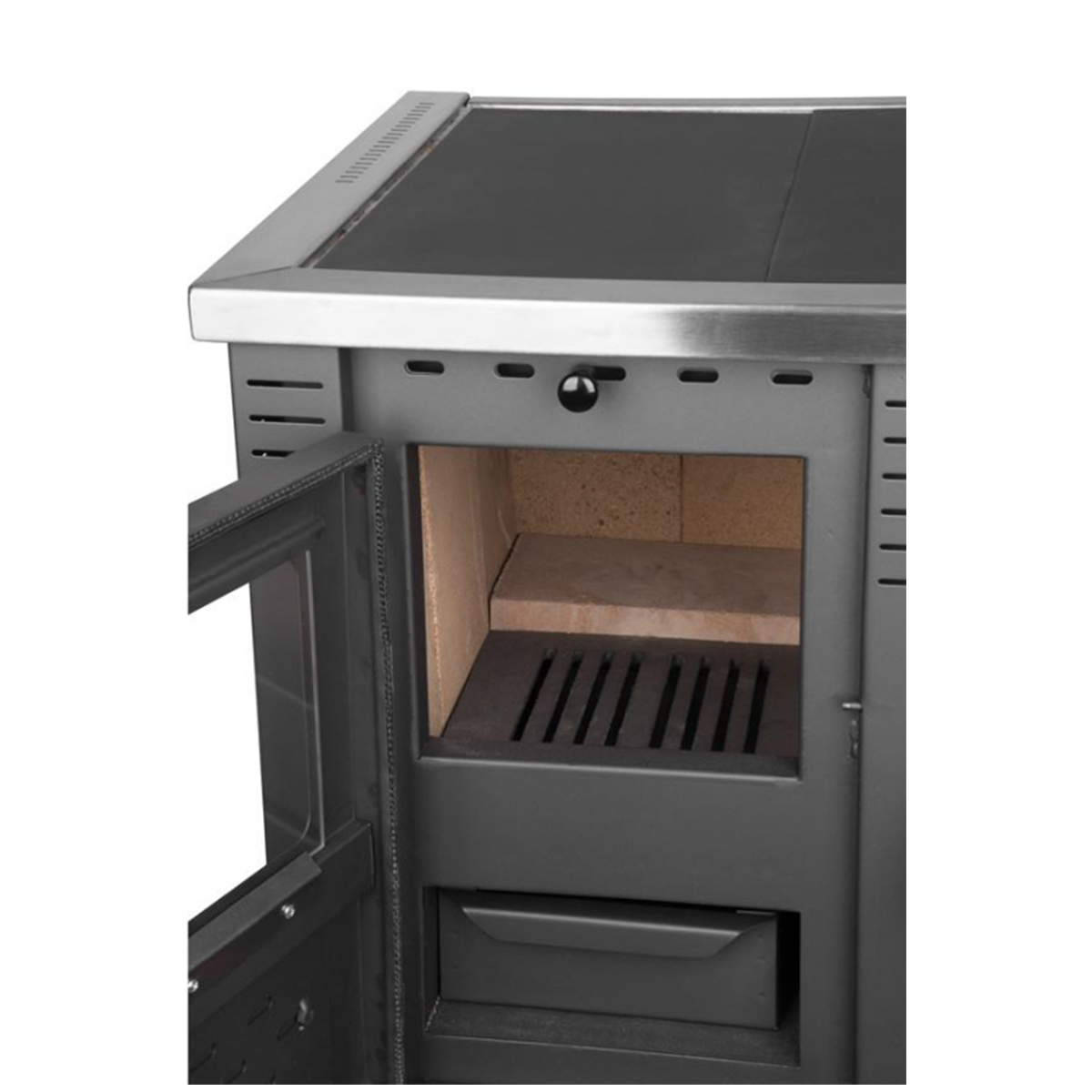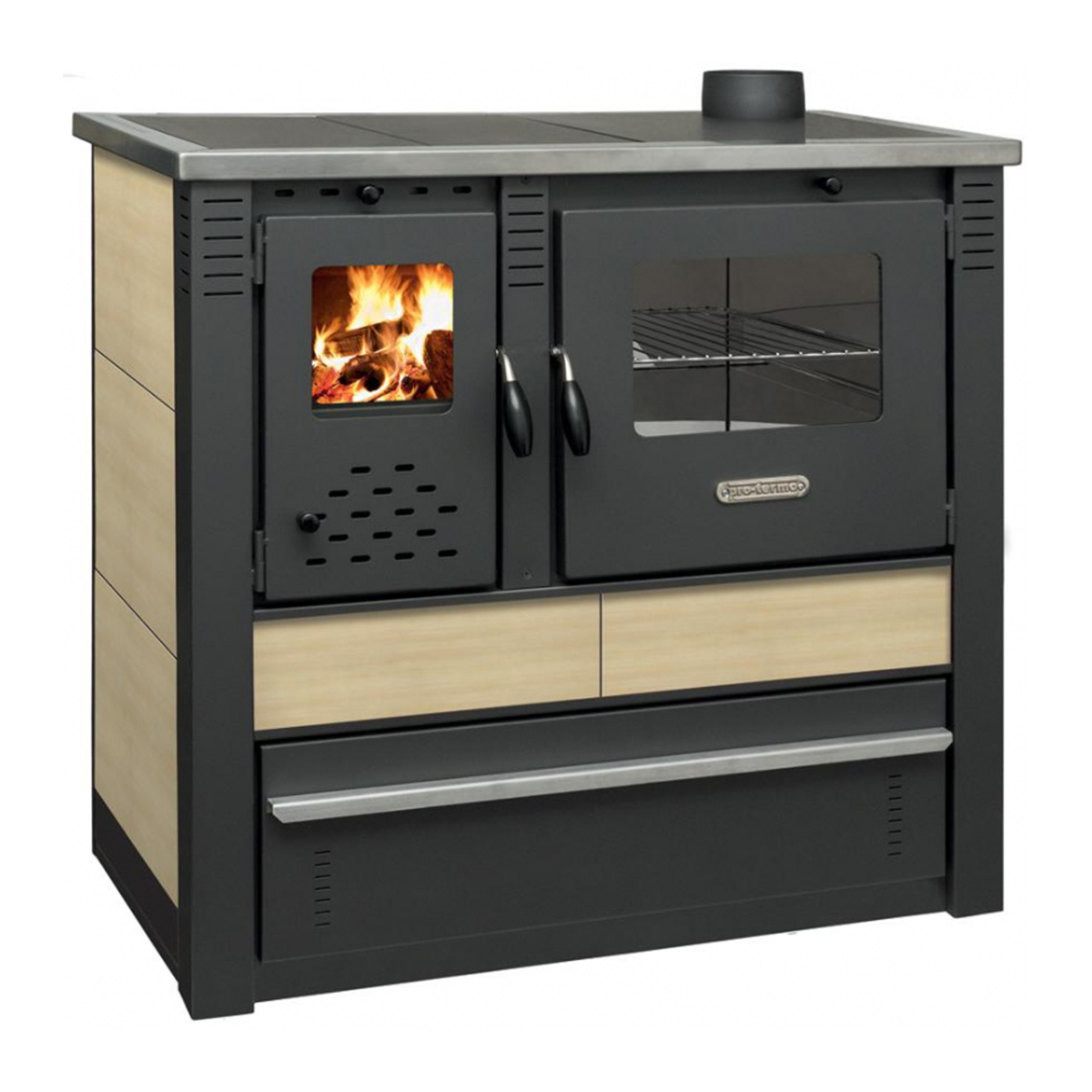 Sporák na tuhé palivo – pravý vývod | Pro PANONIA je sporák na drevo a drevné brikety. Má jednoduchú obsluhu. Sporák je multifunkčný – je vhodný na varenie, pečenie, dokonca aj vykurovanie. Sporák disponuje varnými platňami, regulátorom prívodu vzduchu a prúdenia tepla, praktickými dvierkami ohniska a dvierkami rúry na pečenie. Hlavný prívod vzduchu je regulovateľný pomocou klapky na dvierkach ohniska. Vedľajší prívod vzduchu umožňuje spaľovanie čistejšieho paliva, je regulovateľný pomocou klapky na dvierkach ohniska. Sporák má úspornú prevádzku.