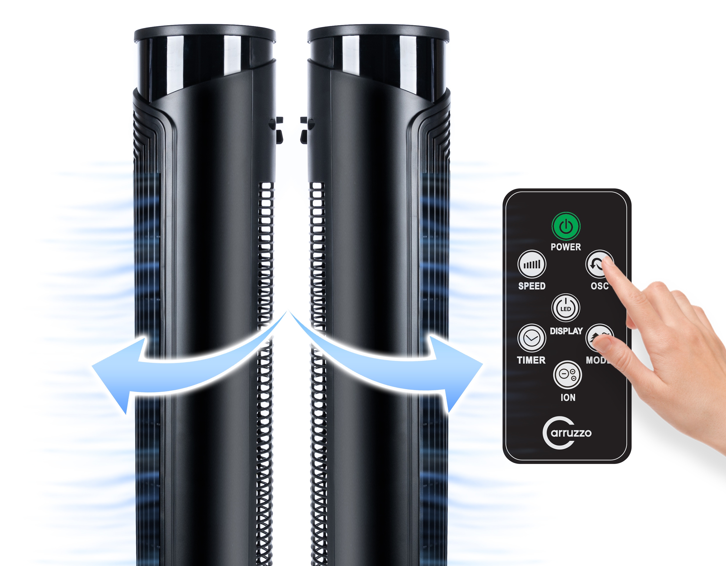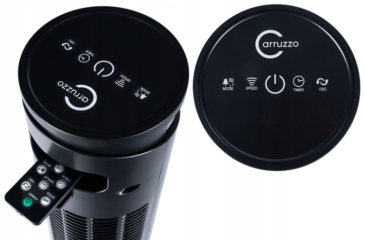 Stĺpový ventilátor s diaľkovým ovládaním, 45W | Carruzzo (Výstavný kus) s moderným dizajnom a silou prúdenia vzduchu zaisťuje príjemné chladenie v teplých dňoch. Pevná základňa zabraňuje pádom a oscilácia umožňuje rovnomerné chladenie celej miestnosti. Na rozdiel od štandardných ventilátorov, ktoré fúkajú vzduch len vo výške vrtule, vežové ventilátory fúkajú vzduch po celej svojej výške.