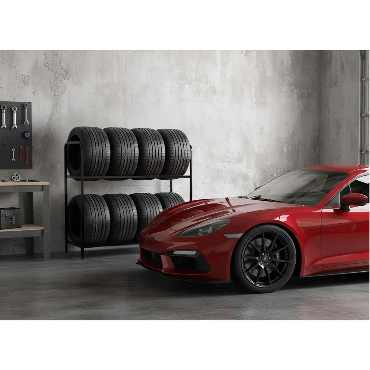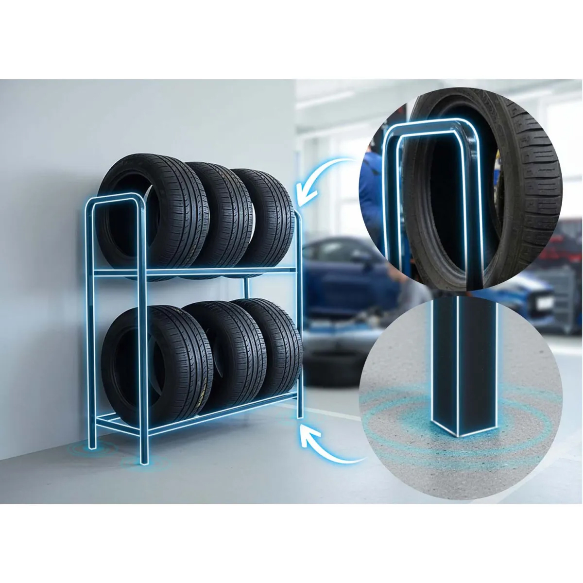 Vďaka jednoduchému montážnemu systému je možné stojan rýchlo zložiť alebo rozložiť a prispôsobiť ho rôznym priestorom – stena, roh či voľne stojace usporiadanie. S kompaktnými rozmermi stojana ušetríte miesto v garáži a zároveň máte pneumatiky uložené bezpečne, bez kontaktu s podlahou či inými predmetmi, čím sa znižuje riziko deformácie či iných poškodení. Celkovo ide o praktické a efektívne riešenie na organizované uskladnenie pneumatík.