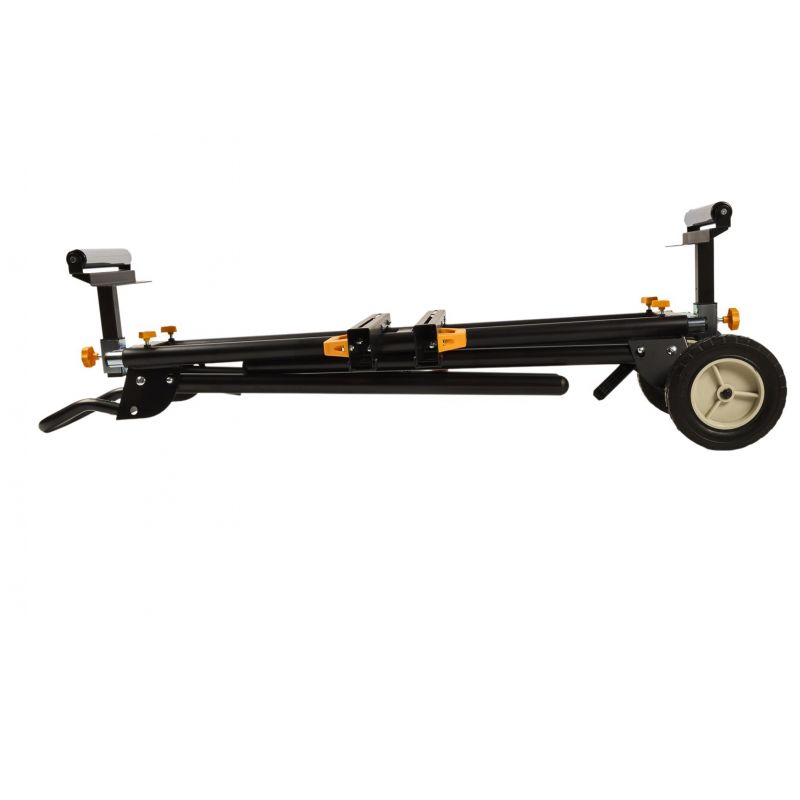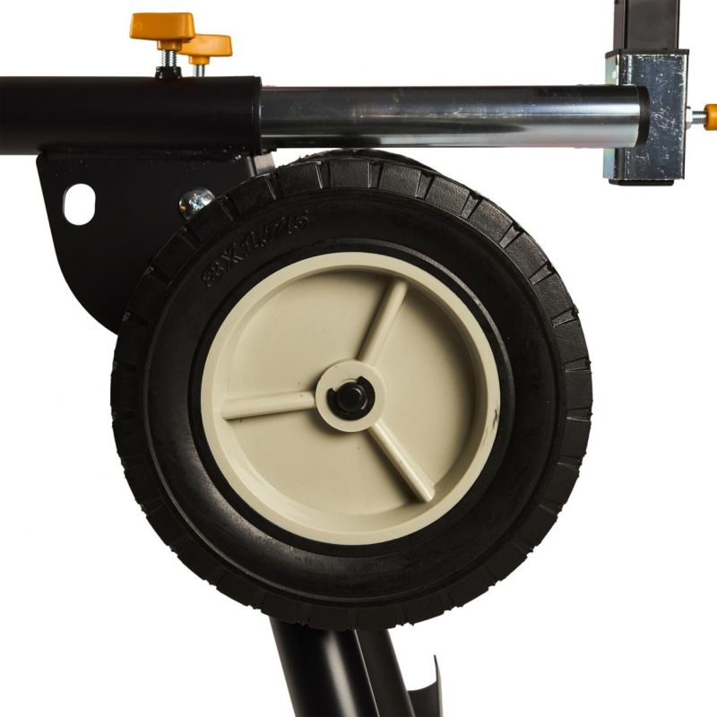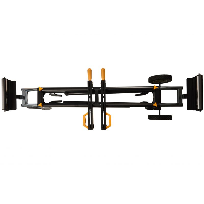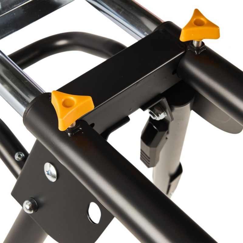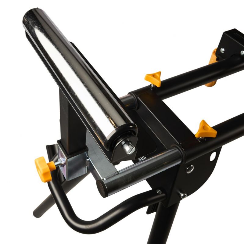 Stojan je vybavený výsuvnými bočnými podperami, ktoré umožňujú rozšírenie pracovnej plochy až na 216 cm, čo výrazne uľahčuje manipuláciu s dlhými obrobkami. Nastaviteľná výška pracovnej plochy (81 cm) a možnosť vyrovnania nerovností podlahy pomocou regulovateľnej nohy zabezpečujú pohodlnú a bezpečnú prácu. Skladacia konštrukcia stojana umožňuje jednoduché zloženie a kompaktné uskladnenie, čo šetrí miesto v dielni alebo garáži.