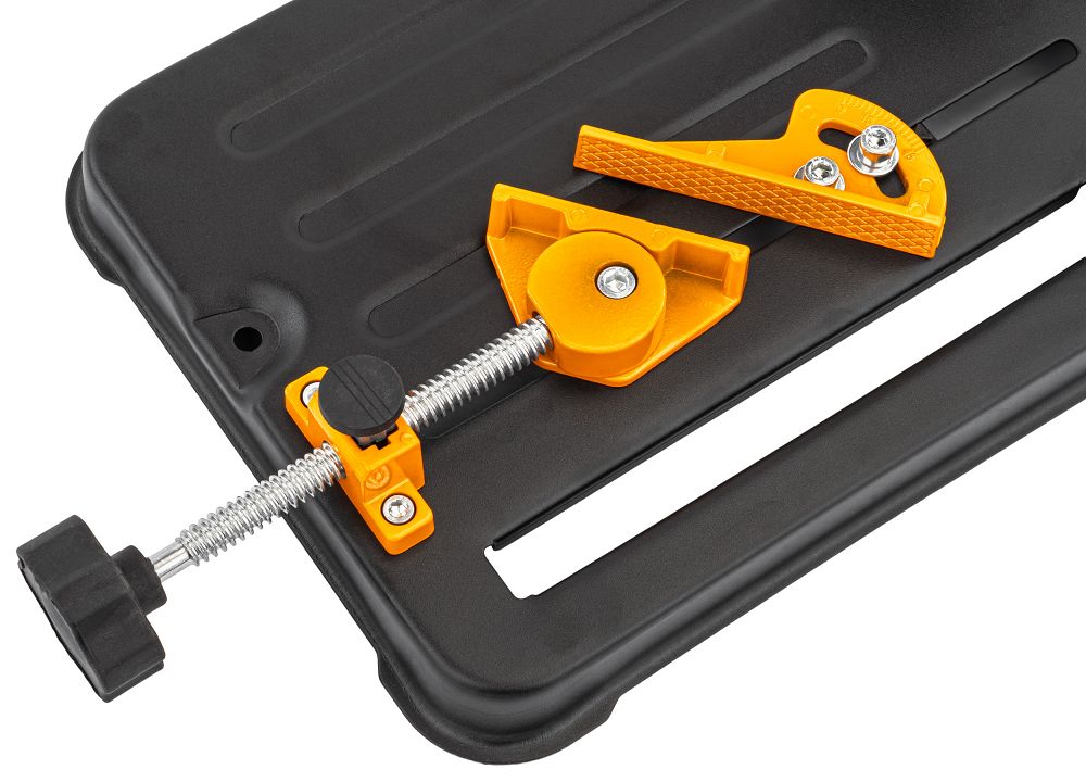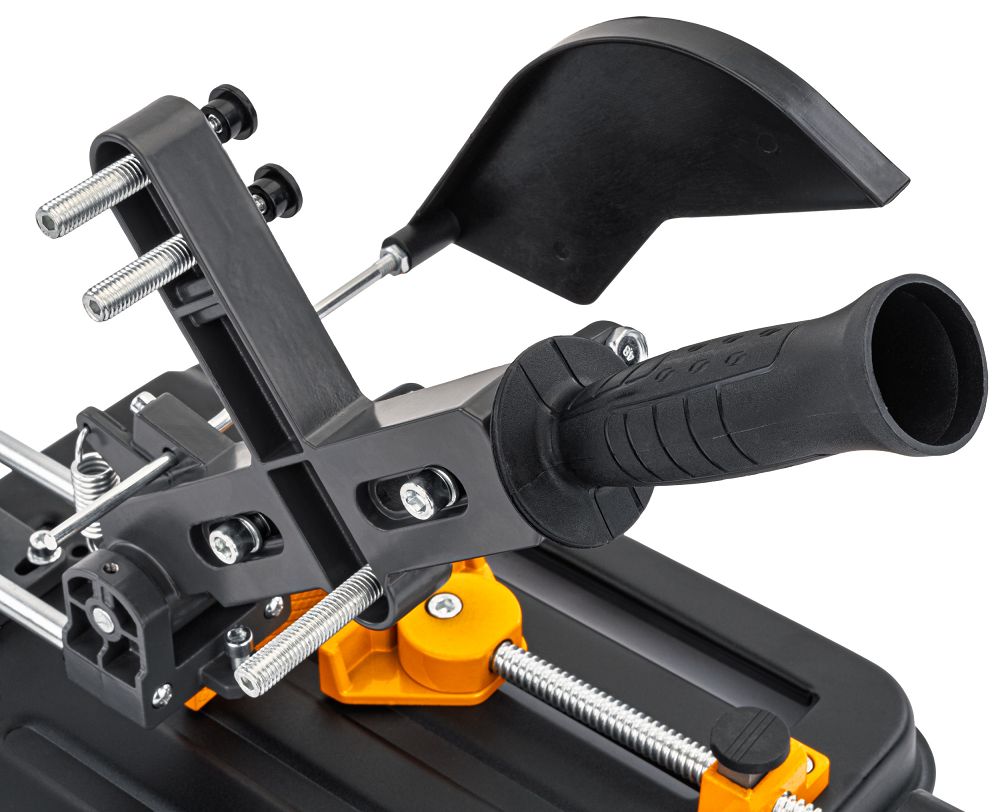 Pevná základňa z liatej ocele zaisťuje bezpečné upevnenie stojana k pracovnému stolu a vysokú odolnosť proti zaťaženiu. Otočný zverák umožňuje nastaviť uhol rezu od 0° do 45°, čo umožňuje presné opracovanie rôznych kovových komponentov. Mechanizmus blokovania posuvu a hĺbky rezu zabezpečuje opakované nastavenia a uľahčuje prácu pri sériových úlohách.