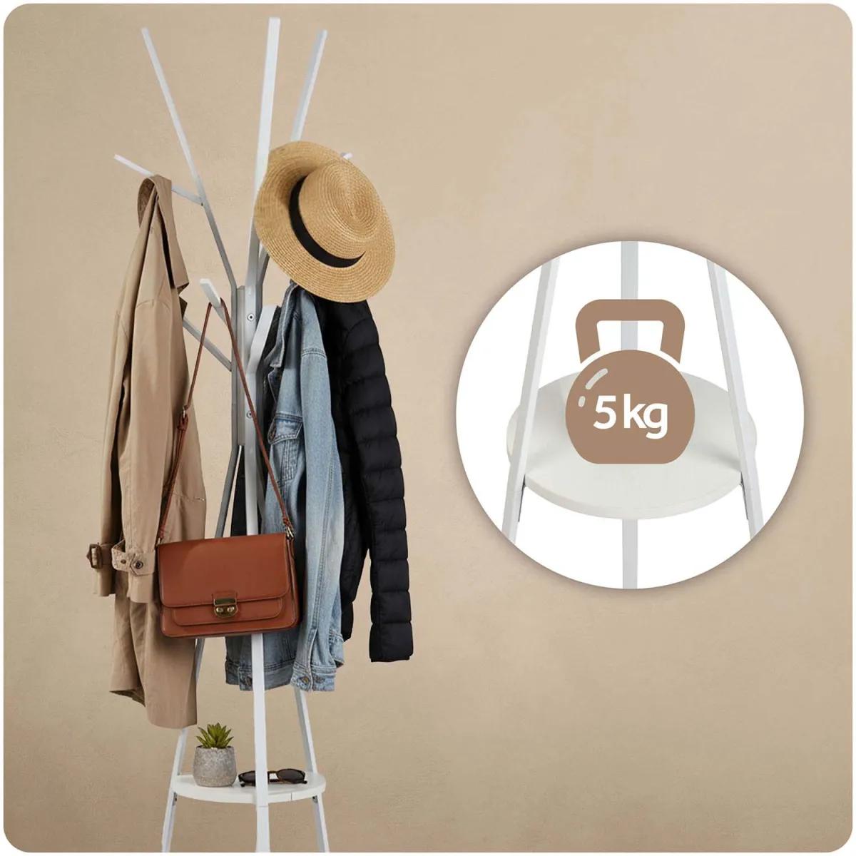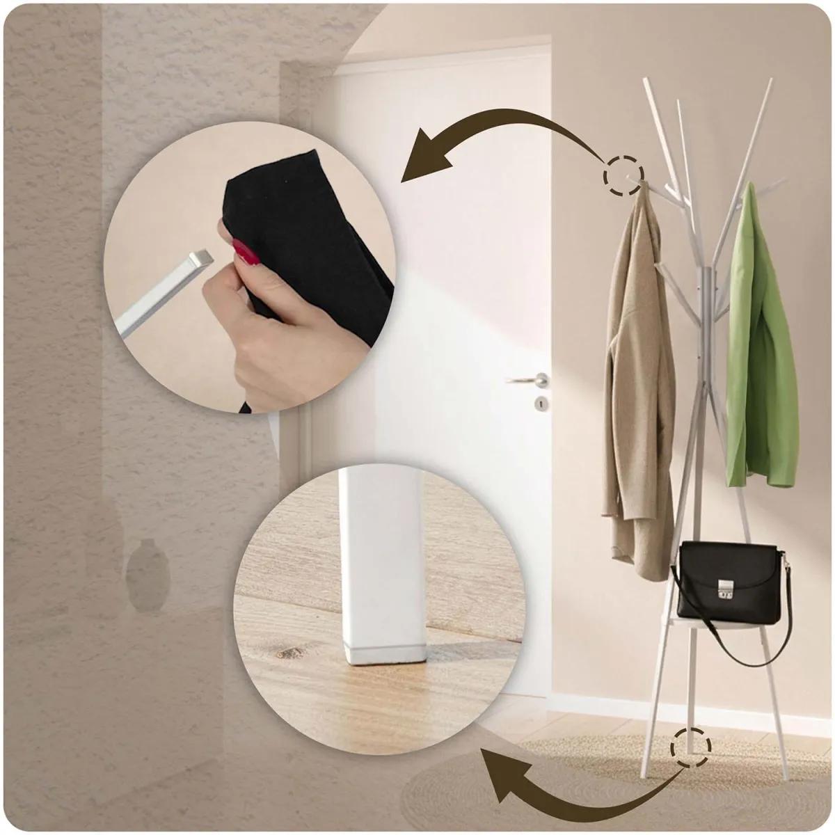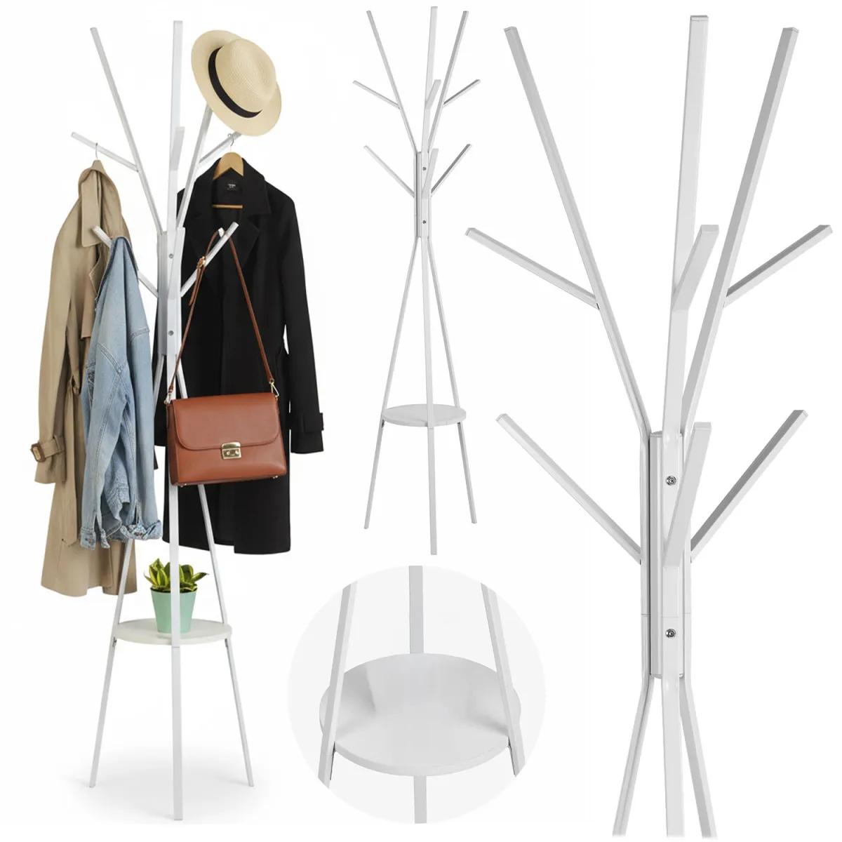 Stojanový vešiak na odevy MS-869, biely | Massido poskytuje praktické riešenie na zavesenie oblečenia s dodatočnou policou na doplnky. Vešiak ponúka praktické riešenie pre organizovanie šatníka či vstupnej chodby – disponuje viacerými háčikmi na kabáty, bundy, tašky či čiapky a zároveň je vybavený policou na drobnosti ako rukavice, klobúky či dekorácie. Jeho pevná konštrukcia zabezpečuje stabilitu, zatiaľ čo jednoduchý dizajn sa ľahko začlení do rôznych interiérových štýlov.