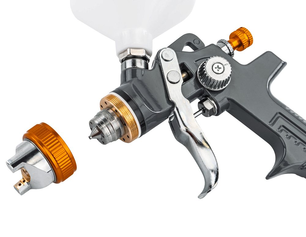 Striekacia pištoľ dosahuje najlepšie výsledky pri pracovnom tlaku 3–4 bar, čo zabezpečuje stabilné a kontrolované striekanie materiálu. Gombík na rukoväti a univerzálna tryska 1,4 mm umožňujú nastaviť prúd vzduchu z kompresora. Zvýšením objemu vzduchu sa zlepšuje rozprašovanie a roztierateľnosť náteru, zatiaľ čo znížením prietoku môžete pracovať s hustejšími materiálmi a na menšej ploche.