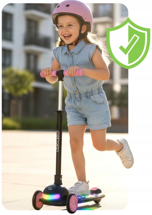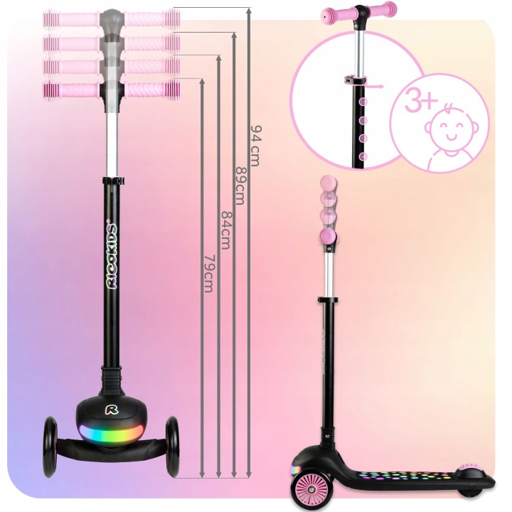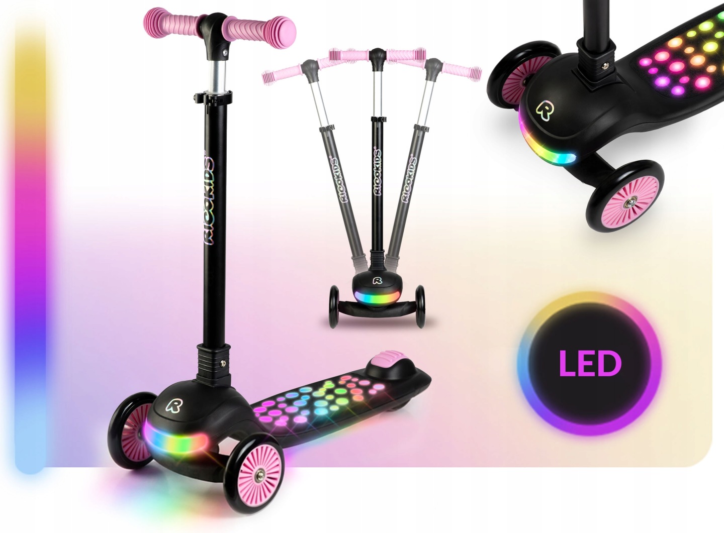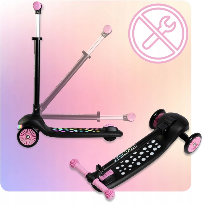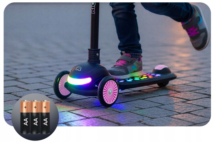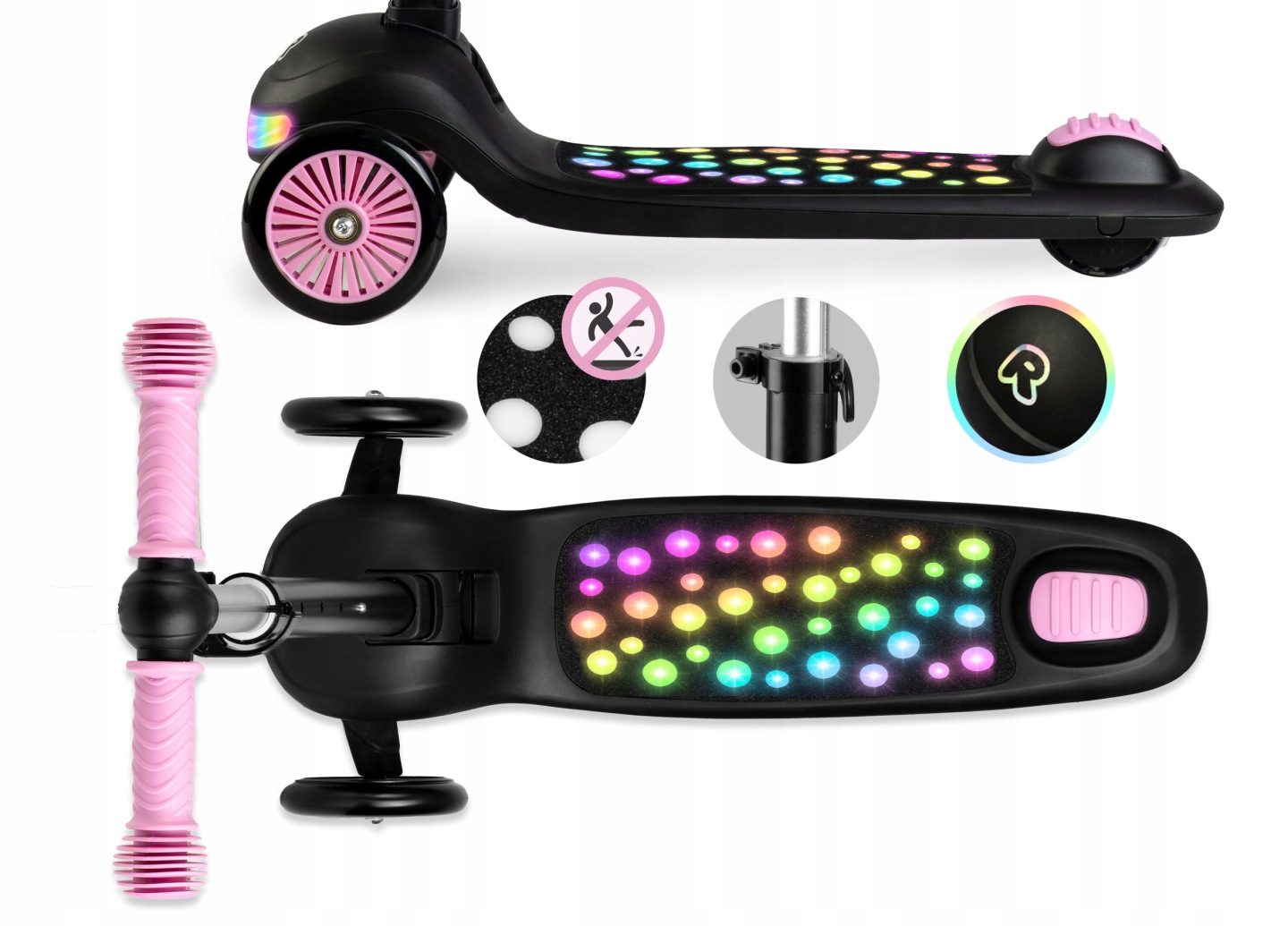 Svietiaca trojkolesová kolobežka, čierno-ružová | Ricokids Glowi ponúka stabilnú jazdu a jednoduché ovládanie, podporujúce rozvoj rovnováhy a koordinácie. Ľahká konštrukcia umožňuje jednoduchú manipuláciu a dobrú kontrolu pri jazde. Model je vybavený svietiacimi LED prvkami, ktoré zvyšujú viditeľnosť a zároveň robia jazdu atraktívnejšou najmä za zhoršených svetelných podmienok.