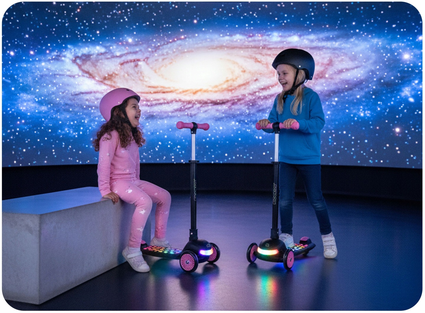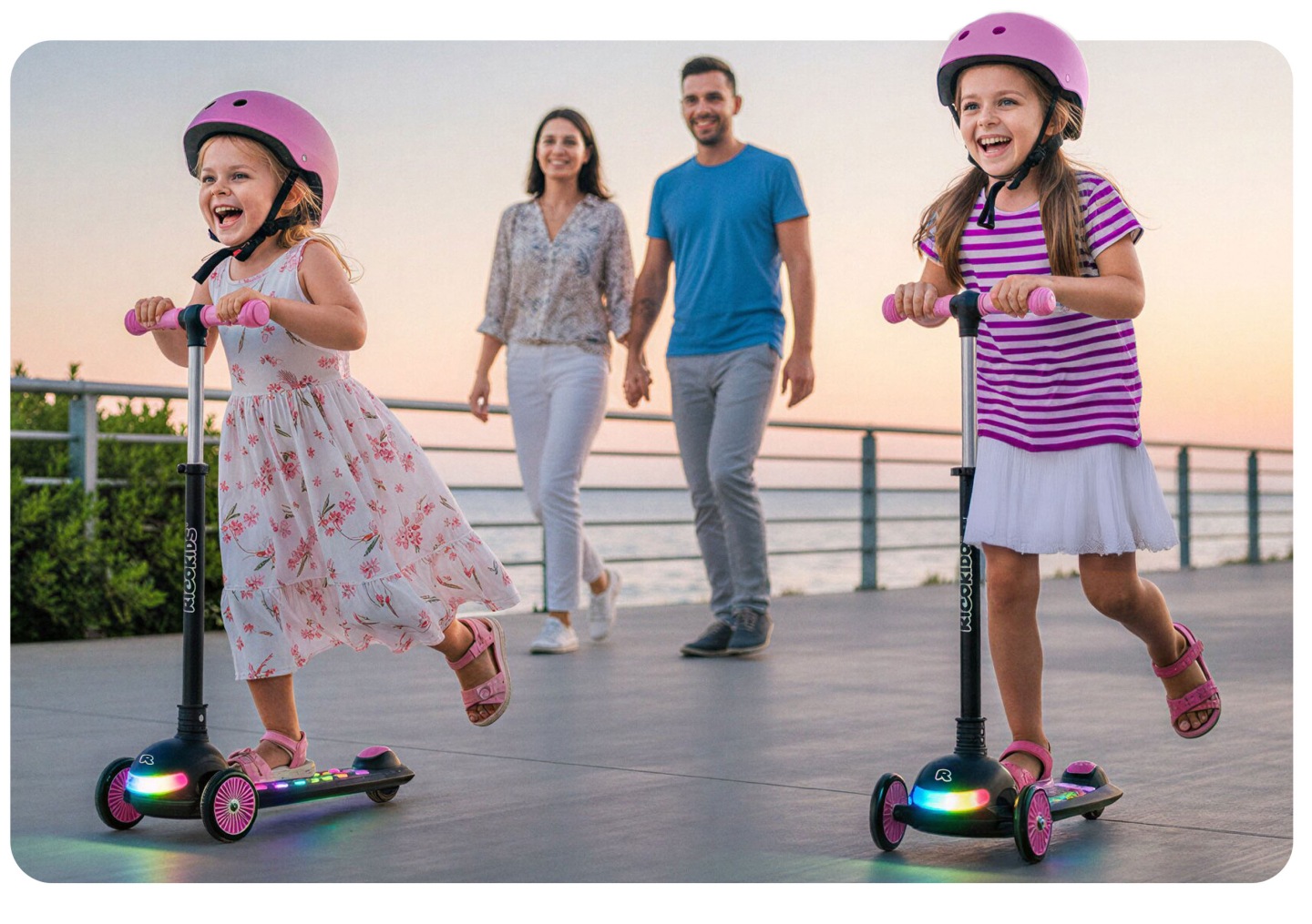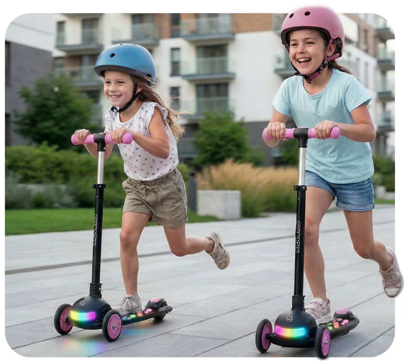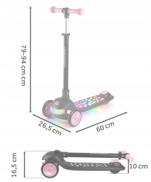 Svietiaca trojkolesová kolobežka, čierno-ružová | Ricokids Glowi ponúka stabilnú jazdu a jednoduché ovládanie, podporujúce rozvoj rovnováhy a koordinácie. Ľahká konštrukcia umožňuje jednoduchú manipuláciu a dobrú kontrolu pri jazde. Model je vybavený svietiacimi LED prvkami, ktoré zvyšujú viditeľnosť a zároveň robia jazdu atraktívnejšou najmä za zhoršených svetelných podmienok.