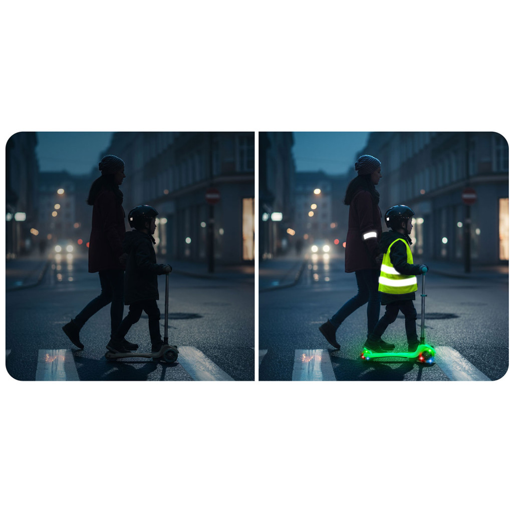 Ľahká a obratná konštrukcia zabezpečuje jednoduchú manipuláciu a dobrú kontrolu pri jazde. Je vybavená svietiacimi prvkami, ktoré zvyšujú viditeľnosť a robia jazdu atraktívnejšou najmä za zhoršených svetelných podmienok. Pevná základňa a kvalitné spracovanie zabezpečujú stabilitu a komfort pri používaní. Skladacia konštrukcia umožňuje rýchle zloženie a jednoduché prenášanie alebo uskladnenie.