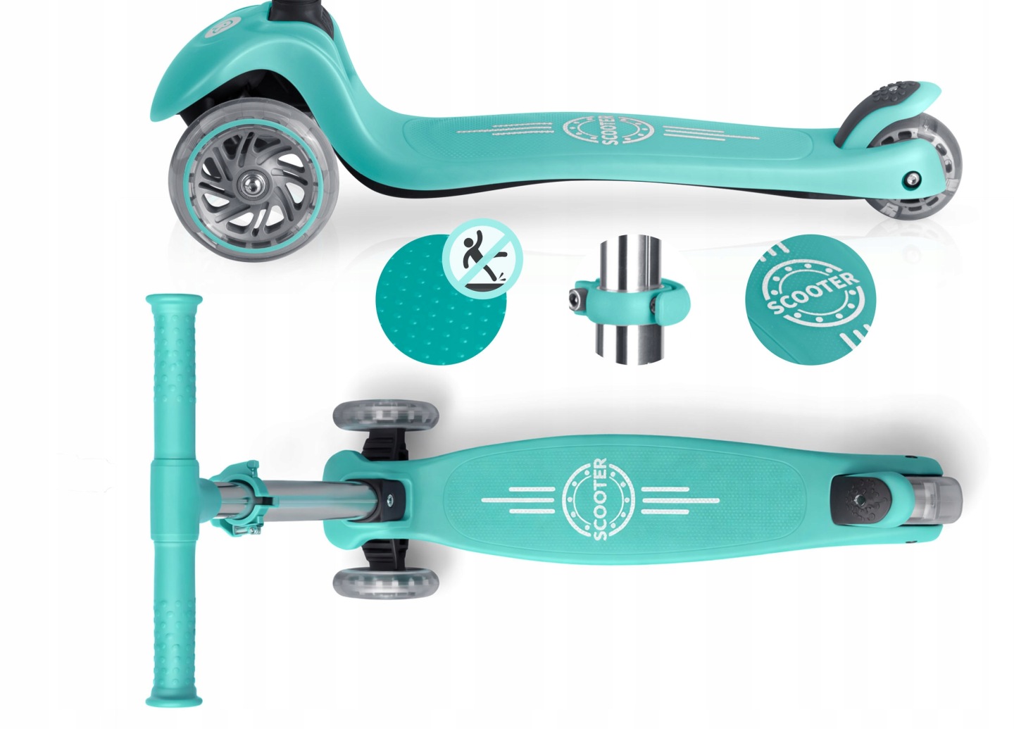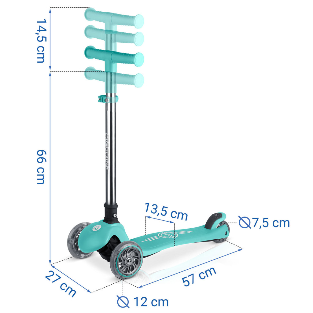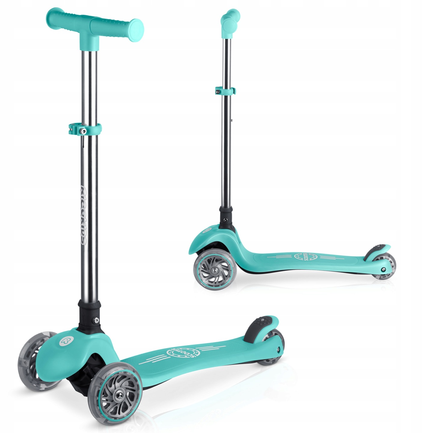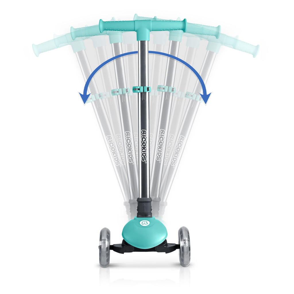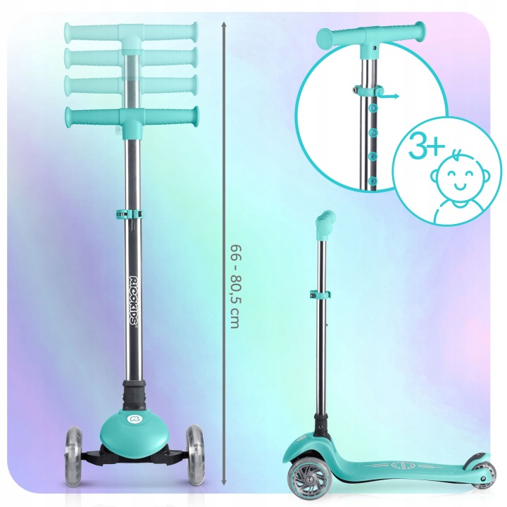 Svietiaca trojkolesová kolobežka, tyrkysová | Ricokids Glow ponúka stabilnú jazdu a zábavné osvetlenie, ktoré zvyšuje viditeľnosť pri pohybe. Kolobežka zabezpečuje stabilnú a pohodlnú jazdu, pričom ovládanie pomocou nakláňania tela podporuje prirodzený rozvoj rovnováhy a koordinácie.