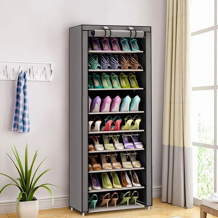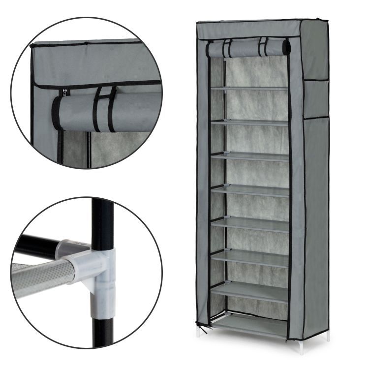 Textilná skriňa s policami, šedá | ModernHome poskytuje dostatok úložného priestoru a zároveň je štýlovým doplnkom vašej predsiene či spálne. Skriňa disponuje 9 policami, ktoré umožňujú prehľadne a pohodlne ukladať obuv, oblečenie aj doplnky. Vďaka tomu rýchlo nájdete potrebné veci bez hľadania na viacerých miestach. Jednoduchý dizajn sa hodí do každého interiéru bez ohľadu na jeho charakter.