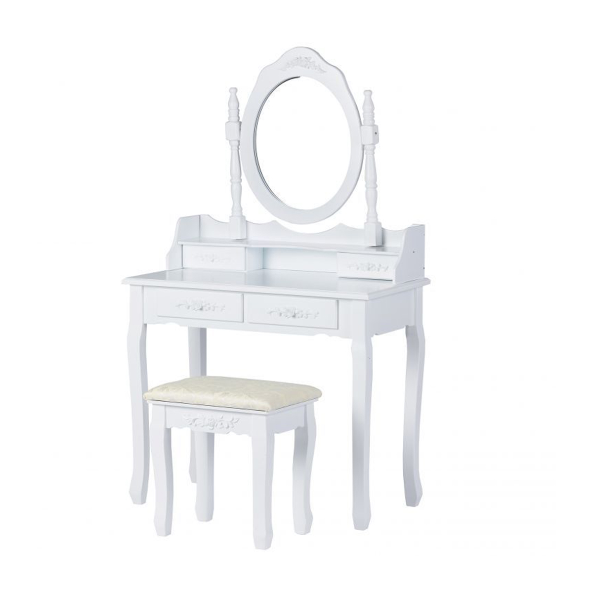 Toaletný stolík má vo vnútri 4 zásuvky, vďaka ktorým každá dáma určite zorganizuje svoju kozmetiku a doplnky na líčenie. Zásuvky sú tiež ideálne na uloženie šperkov a veľké zrkadlo s nastaviteľným sklonom vám pomôže vybrať si ten správny doplnok pre svoju tvorbu. Veľká plocha pracovnej dosky umožňuje slobodu pri každodenných činnostiach, takže maľovanie nebude problémom.