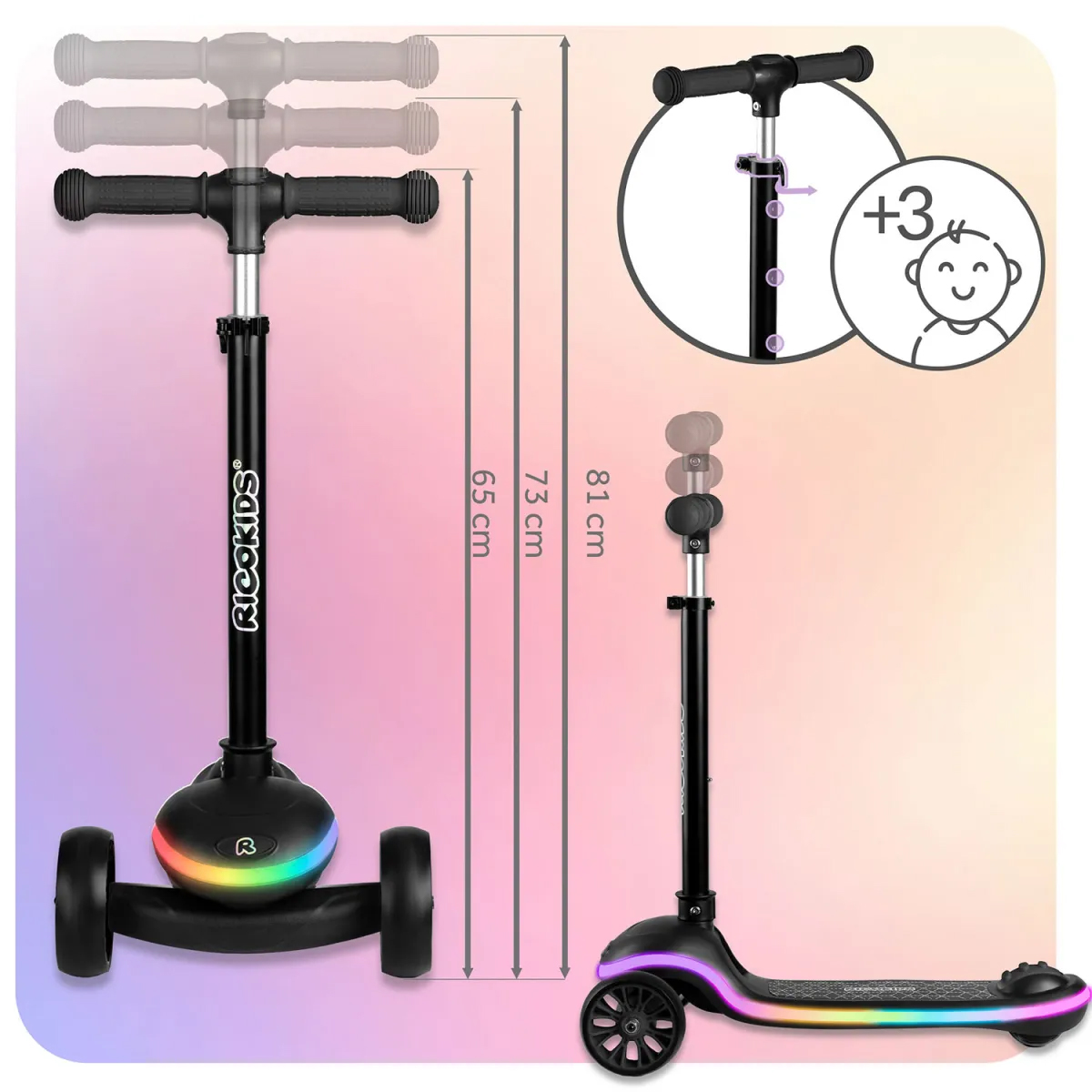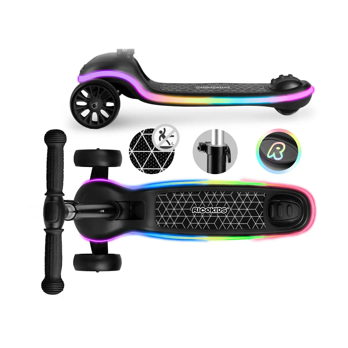 Trojkolesová kolobežka, čierna, LED | Ricokids Leddi ponúka stabilnú a bezpečnú jazdu a pomáha rozvíjať rovnováhu a koordináciu pohybu. Ponúka stabilnú a pohodlnú jazdu aj pre najmenších jazdcov, pričom ovládanie pomocou nakláňania tela prirodzene podporuje rozvoj rovnováhy a koordinácie. Ľahká a obratná konštrukcia uľahčuje manipuláciu a zároveň zabezpečuje dobrú kontrolu pri jazde.