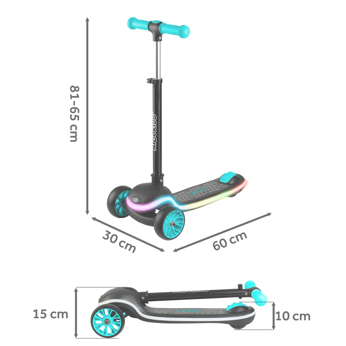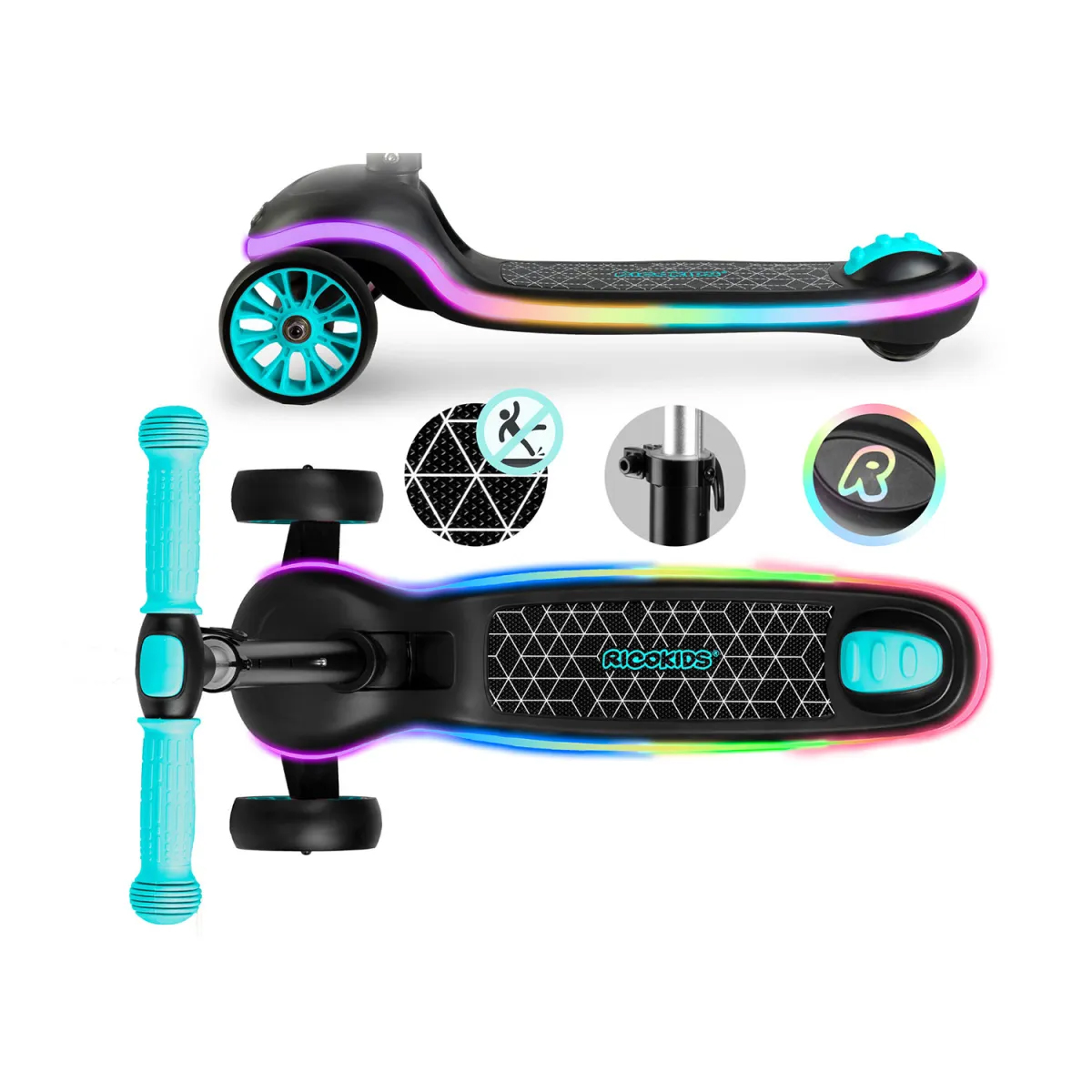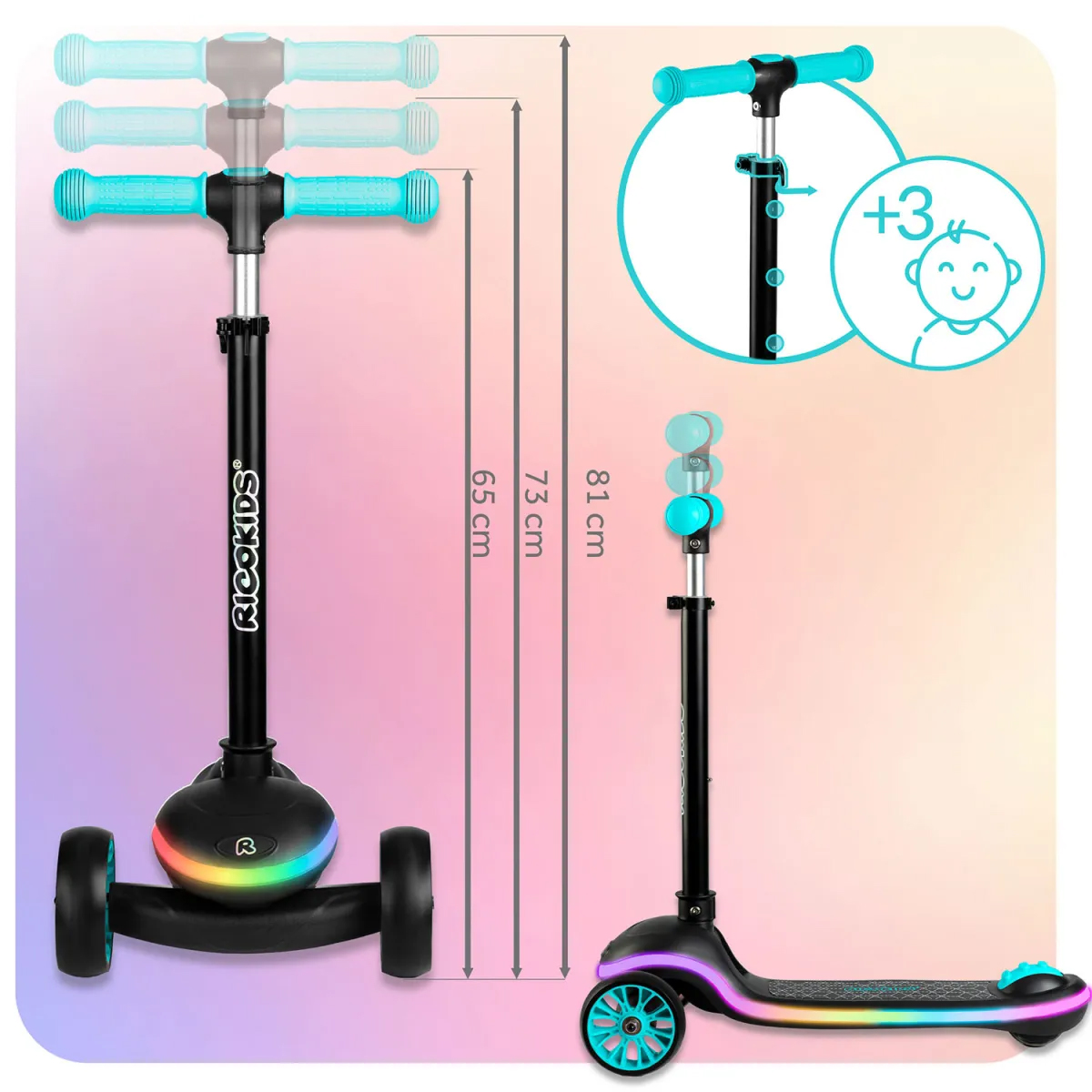 Trojkolesová kolobežka, čierno-tyrkysová, LED | Ricokids Leddi ponúka stabilnú a bezpečnú jazdu a pomáha rozvíjať rovnováhu a koordináciu pohybu. Ponúka stabilnú a pohodlnú jazdu aj pre najmenších jazdcov, pričom ovládanie pomocou nakláňania tela prirodzene podporuje rozvoj rovnováhy a koordinácie. Ľahká a obratná konštrukcia uľahčuje manipuláciu a zároveň zabezpečuje dobrú kontrolu pri jazde.