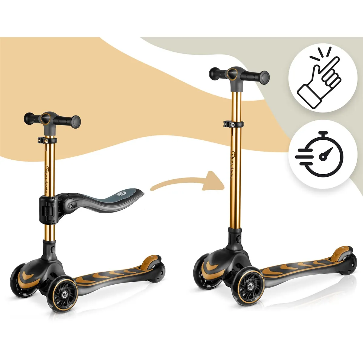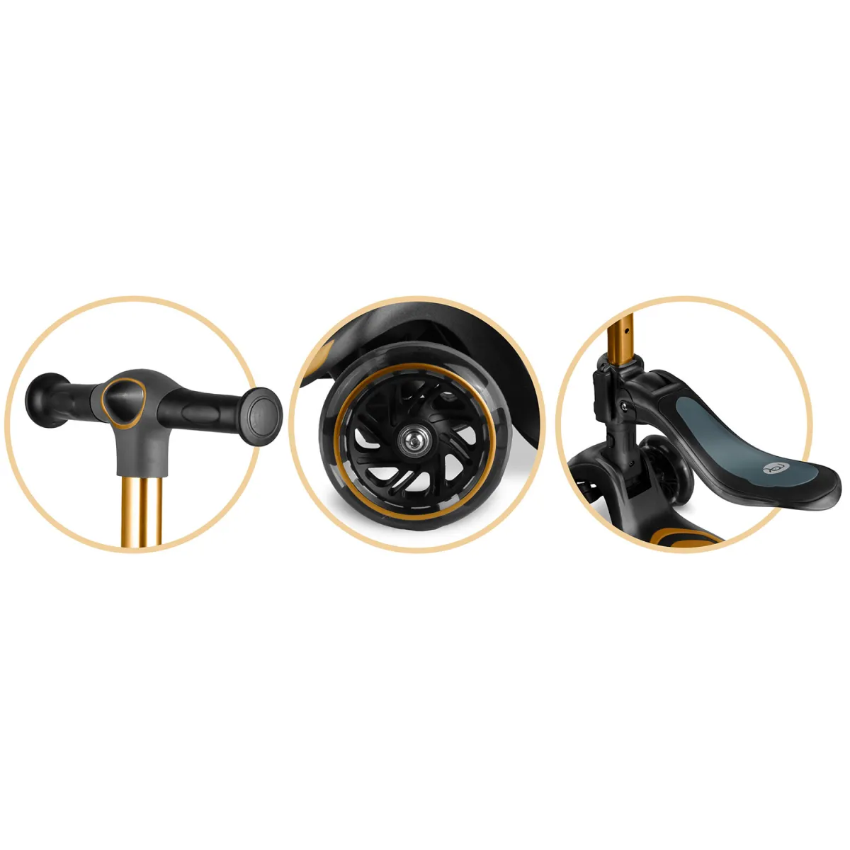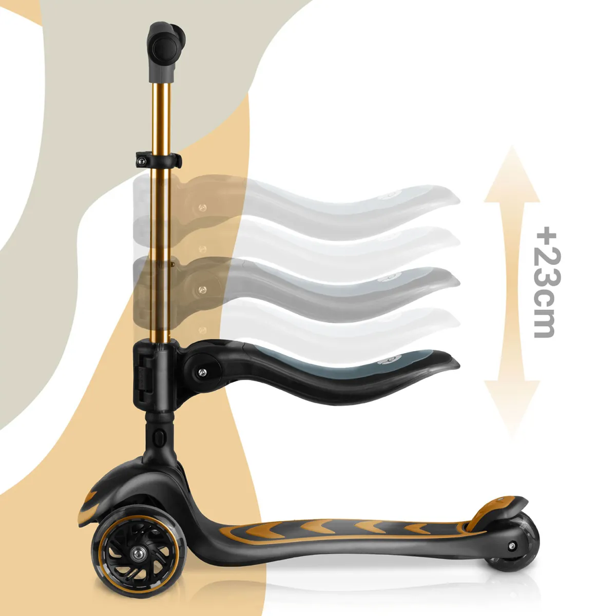 Odnímateľné sedadlo umožňuje prechod z jazdy v sede na jazdu v stoji, čím sa zariadenie stáva univerzálnou voľbou pre menšie aj väčšie deti. Kolobežka je tiež vybavená certifikátmi bezpečnosti (EN 71-1,2,3) a jej maximálna nosnosť je až 50 kg – takže je dostatočne robustná aj pre staršie deti. Elegantné prevedenie v zlatej farbe pridáva štýlový prvok, a tým sa model hodí ako skvelý darček alebo doplnok detskej izby i vonkajšieho hrania.