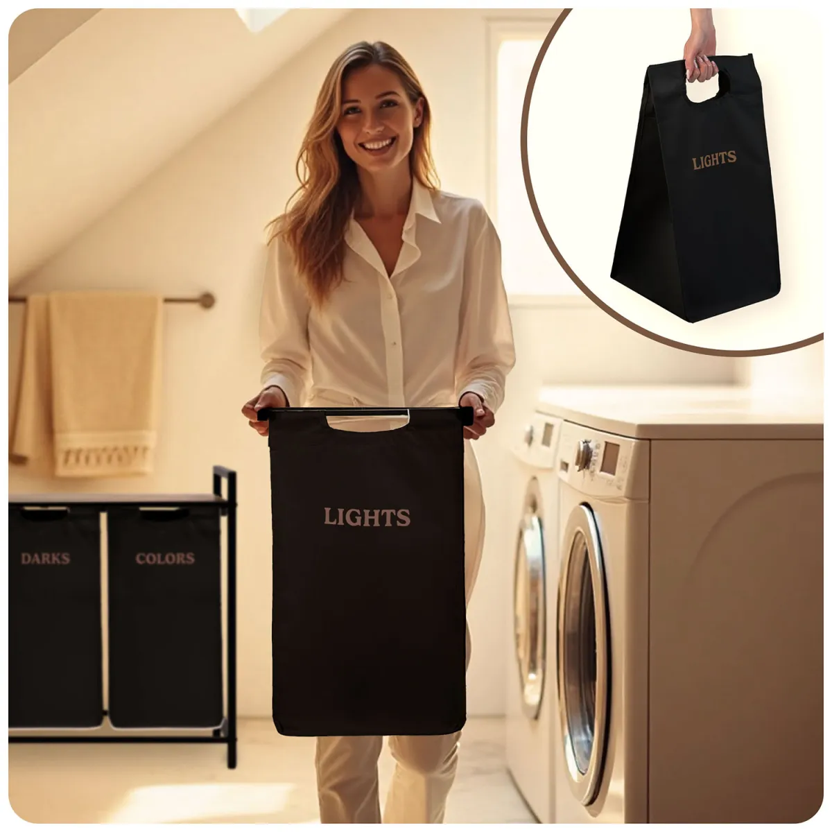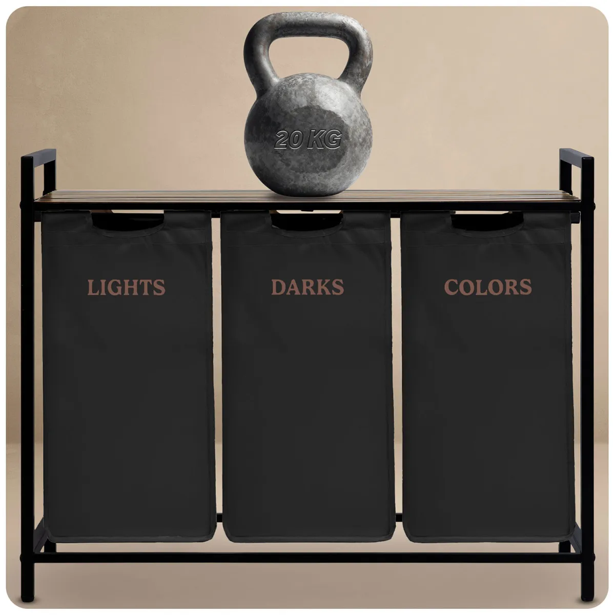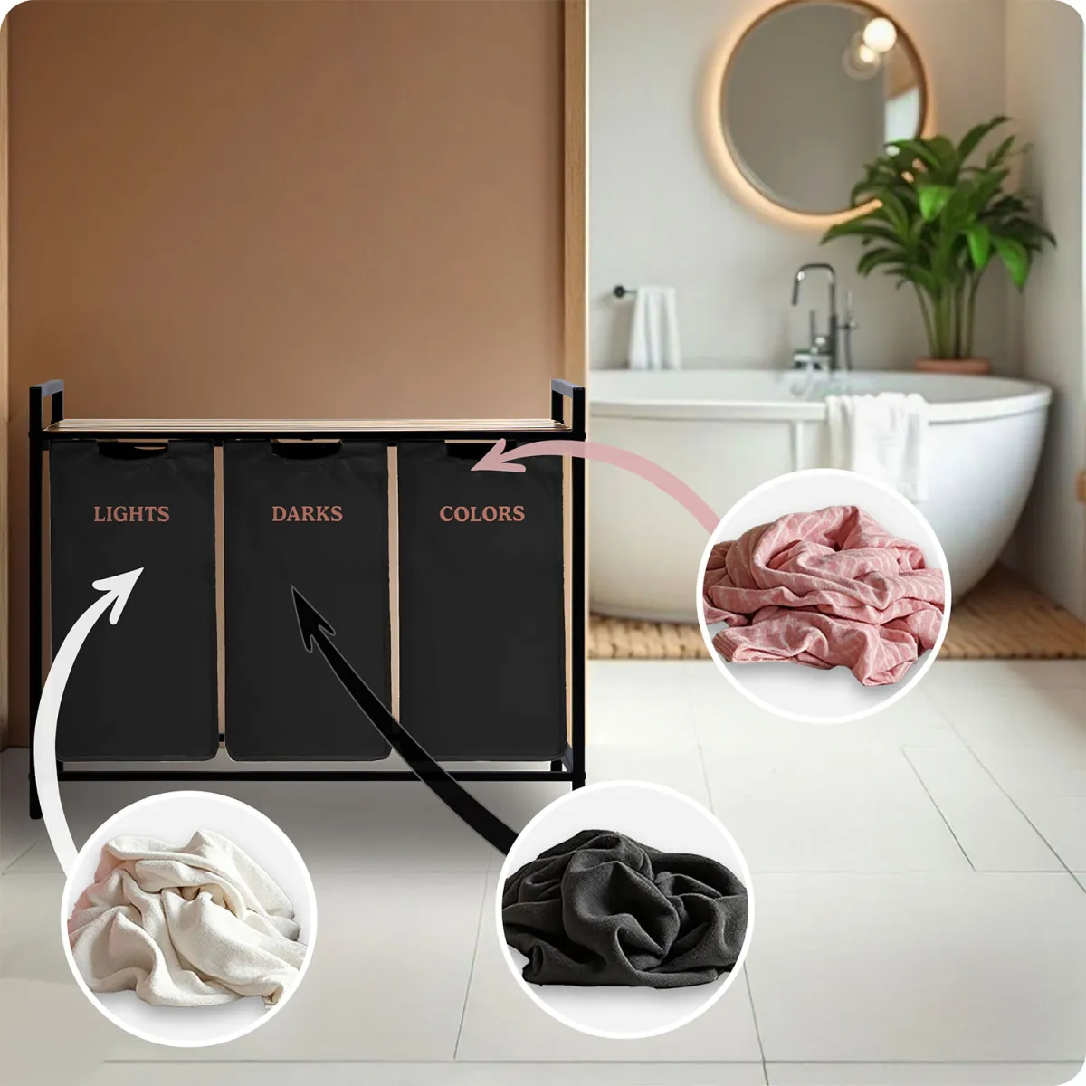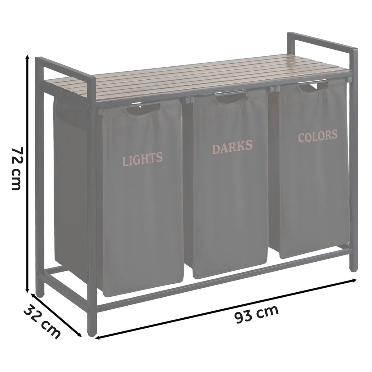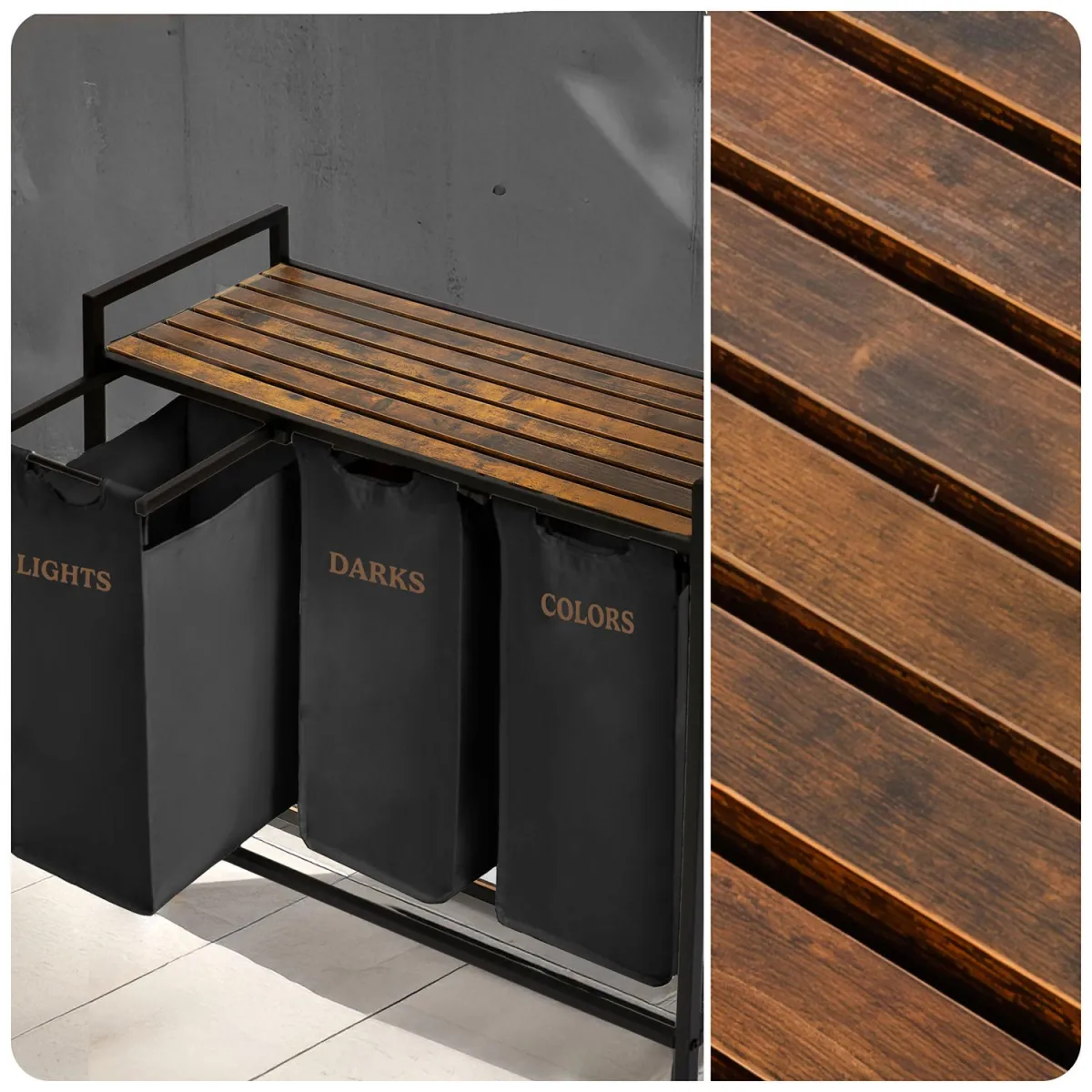 Vďaka tomuto systému šetríš čas pri praní a udržiavaš poriadok bez námahy. Moderný a minimalistický dizajn s drevenými a čiernymi prvkami zapadne do väčšiny interiérov – od kúpeľne po práčovňu. Textilný vak je odnímateľný, ľahko sa udržiava a v prípade potreby ho môžeš jednoducho vybrať a preniesť k práčke. Stabilná kovová konštrukcia zabezpečuje, že kôš nestratí tvar ani pri plnom zaťažení.