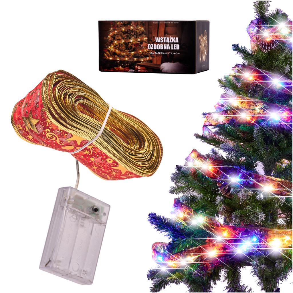 Vianočné osvetlenie, stuha, 10m | 100 LED napájané batériami je ideálne na vytvorenie útulnej a sviatočnej atmosféry kdekoľvek v domácnosti. S dĺžkou 10 metrov je ideálnou vianočnou dekoráciou. Sto farebných svetiel vytvorí slávnostnú atmosféru. Vďaka napájaniu batériami je možné pásik zavesiť kdekoľvek. Osem režimov osvetlenia umožňuje rýchlu zmenu nálady v miestnosti – stačí stlačiť tlačidlo. LED reťaz je vyrobená z vysoko kvalitných materiálov a je úplne bezpečná. Má certifikát CE.
