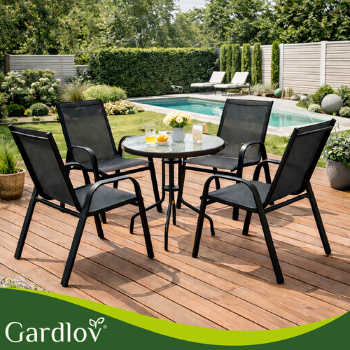 Záhradné stoličky, 4ks, čierna | Gardlov sú praktickým a pohodlným riešením na sedenie na balkóne, terase alebo v záhrade, vhodné na každodenné používanie. Pevná kovová konštrukcia s práškovou povrchovou úpravou zabezpečuje stabilitu a odolnosť voči korózii, zatiaľ čo priedušný sedák z PVC sa prispôsobuje telu a zvyšuje komfort pri sedení.