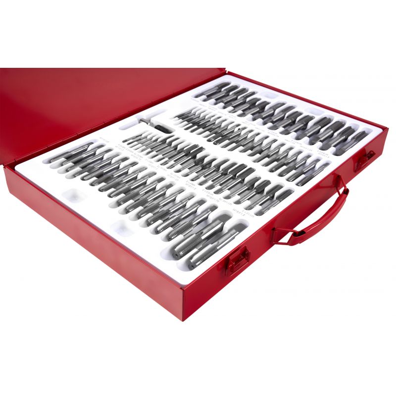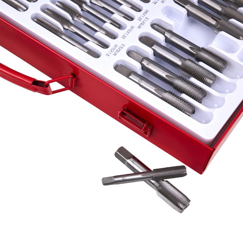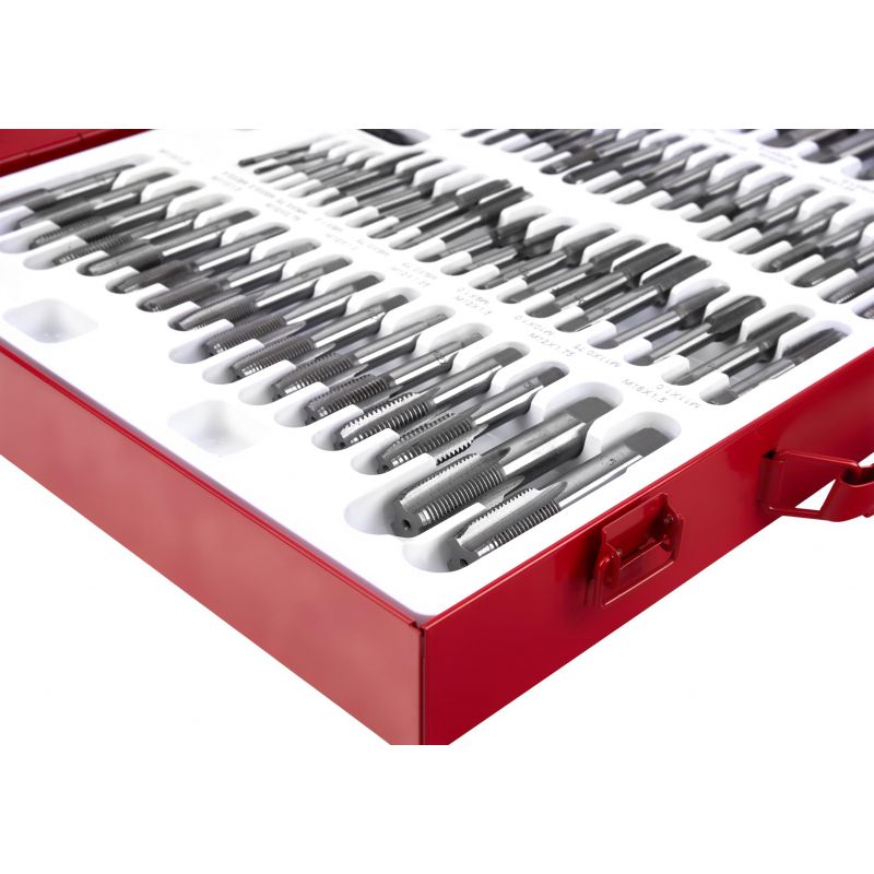 - 35 kužeľových závitníkov – M2X0,4 mm; M3x0,5 mm; M4x0,7 mm; M5x0,9 mm; m6x0,75 mm; M6x1,0 mm; M7x0,75 mm; M7x1,0 mm; M8x0,75 m; M8x1,0 mm; M8x1,25 mm, M9x0,75 mm; M9x1,0 mm; M9x1,25 mm; M10x0,75 mm; M10x1,0 mm; M10x1,25 mm; M10x1,5 mm; M11x0,75 mm; M11x1,0 mm; M11x1,25 mm; M11x1,5 mm; M12x0,75 mm; M12x1,0 mm; M12x1,25 mm; M12x1,5 mm; M12x1,75 mm; M14x1,0 mm; M14x1,25 mm; M14x1,5 mm; M14x2,0 mm; M16x1,5 mm; M16x1,0 mm; M16x2,0 mm; M18x1,5 mm